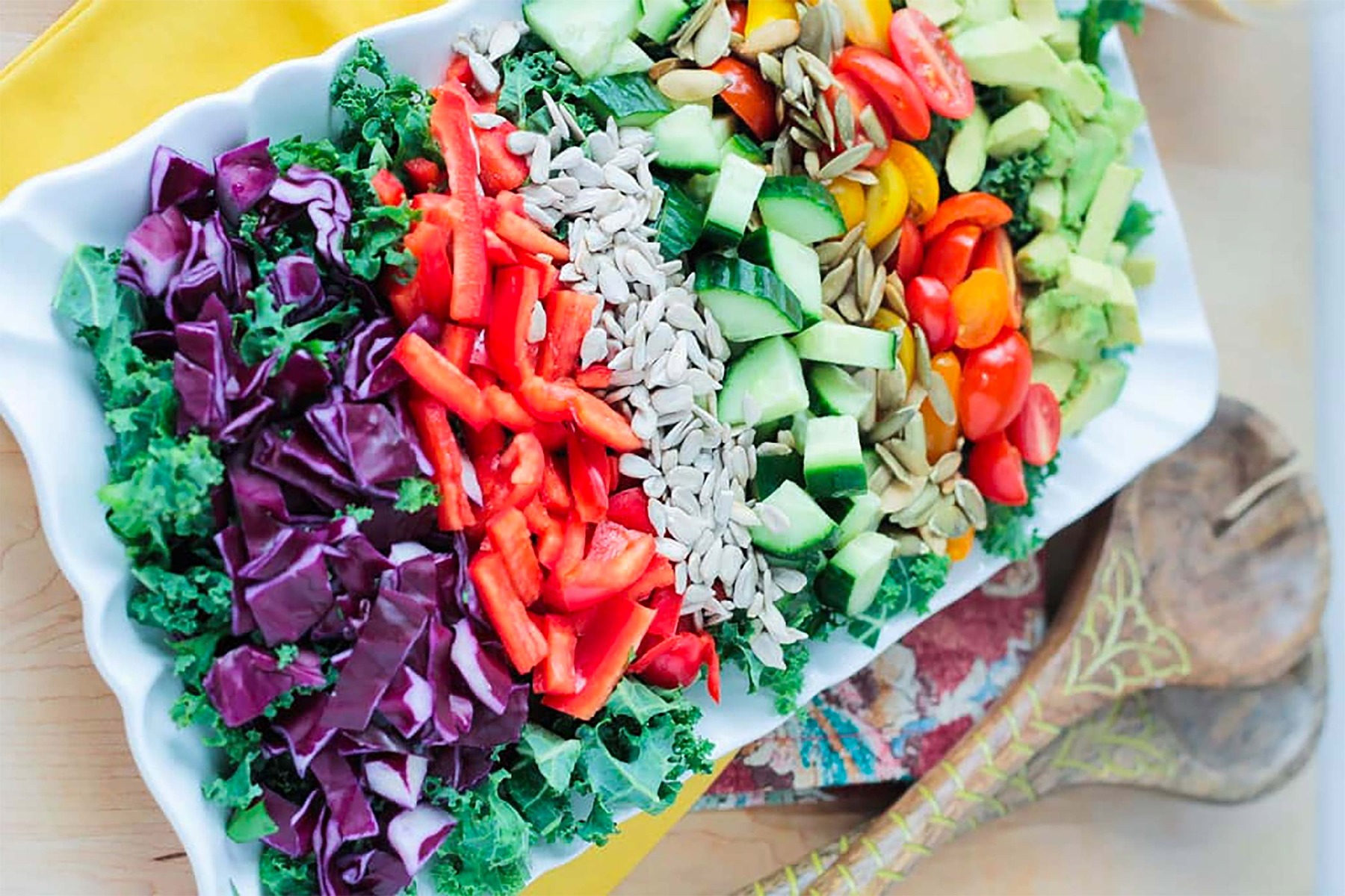 This beautiful chopped salad is a perfect way to eat the rainbow. Almost every color of the spectrum is represented, including a heap of beautiful purple cabbage.
